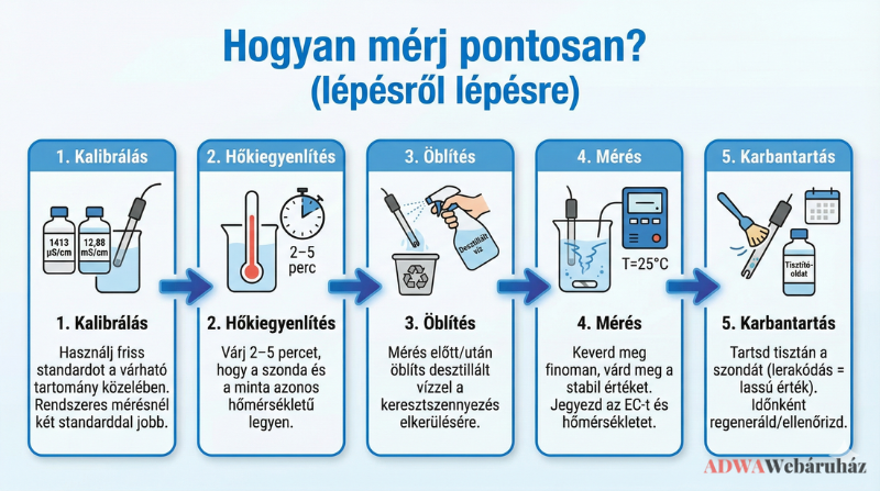 - TDS-ben gondolkodsz → térj át EC-re (25 °C referenciával). A TDS-faktor mintafüggő, összehasonlításra pontatlan.