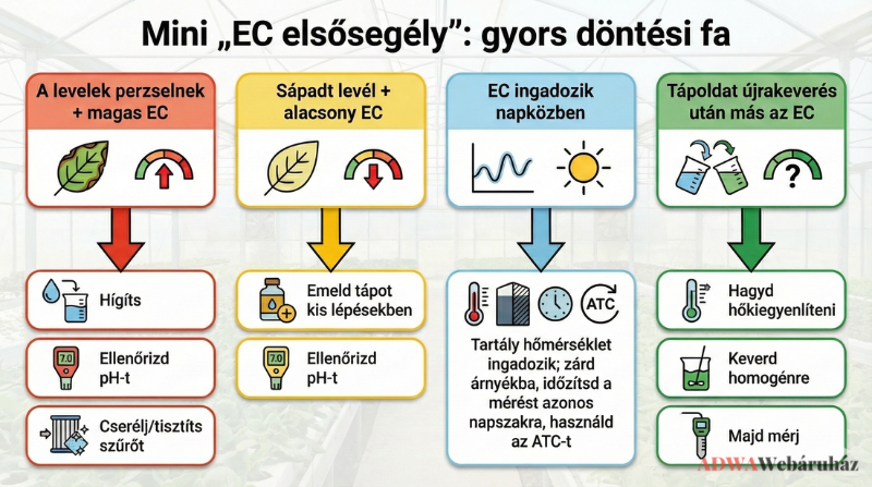 - EC jó, mégis gond van: ellenőrizd a pH-t, hőmérsékletet, oxigénszintet (DO), gyökérzóna tisztaságát. (A pH és ORP/DO külön útmutatókban: lásd pH/ORP cikkeink.)