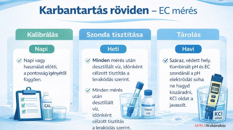 Szondát minden mérés után desztillált vízzel öblítsd le, tárolás száraz és tiszta környezetben. Kombinált pH és EC szondánál a pH rész tárolási előírását kövesd.