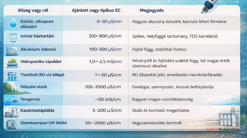 Fontos: az EC nem mondja meg, mely ion van a vízben, csak azt, hogy mennyi. A pH és (bizonyos folyamatoknál) az ORP együttes mérésével lesz teljes a kép.
