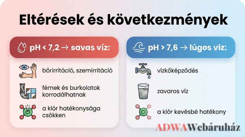 - Zavaros víz, klórszag → a pH nincs optimálisan beállítva, ezért a fertőtlenítés nem hatékony.