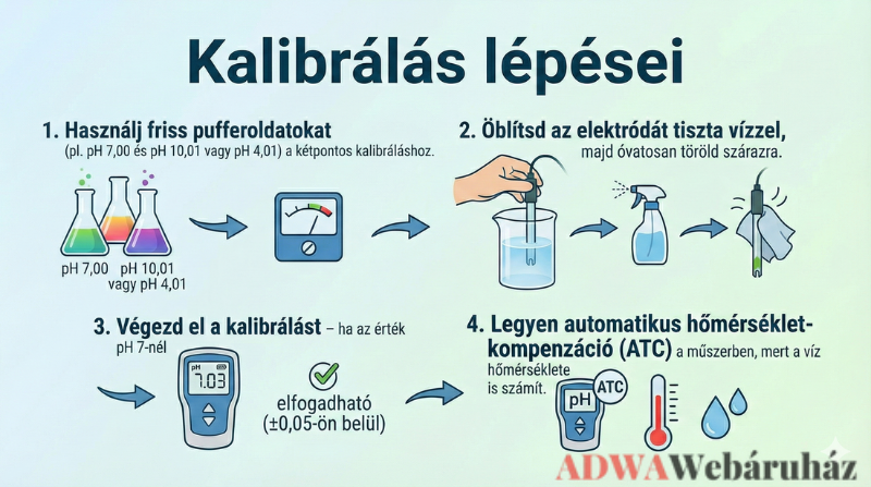 Használat: kézi mérő heti 2x, kétpontos kalibrálás. 2 héten belül stabil pH (7,3–7,5).