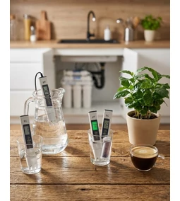 Az EC (elektromos vezetőképesség) az oldott ionok mennyiségével arányos. Az RO a sókat/ionokat eltávolítja, ezért a permeátum EC-je nagyon alacsony lesz (gyakran <30 µS/cm háztartási rendszernél). Az EC ≠ TDS, de szorosan összefügg: sok TDS-mérő valójában EC-t mér és szorzótényezővel becsli a TDS-t.