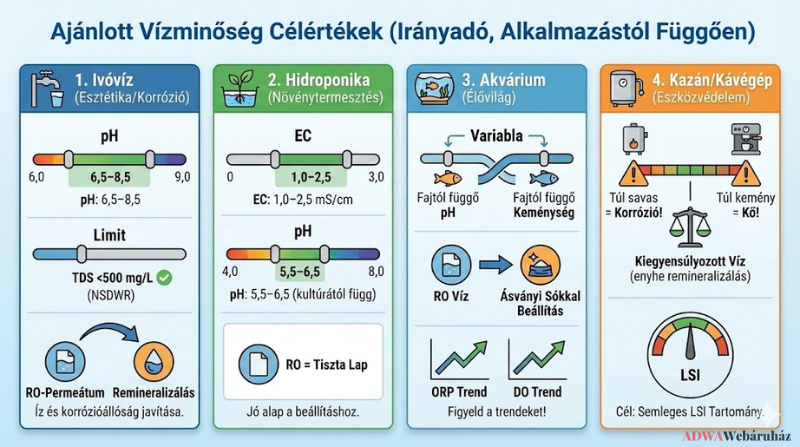 Megjegyzés ivóvízhez: a pH ajánlott esztétikai tartománya 6,5–8,5 (USA NSDWR). A túl alacsony pH korrozív lehet, a túl magas pedig lerakódásokat okozhat.