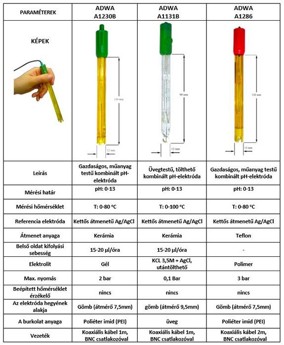Az ADWA pH elektródák a gazdaságos kategóriába tartoznak. De vannak sokkal bonyolultabb felépítésű pH elektródák is, amelyek leírása sokkal hosszabb táblázatot igényel.