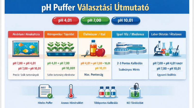 Kétpontos: ha a mintáid szűk tartományban vannak (pl. akvárium 6,5–7,5). Válaszd a pH 7,00‑t és a tartományhoz közelebbi második pontot (4,01 vagy 10,01) — az ASTM szerint így is teljesíted a „legalább két puffer” elvét.