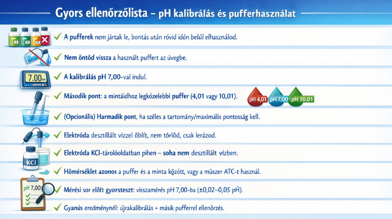 – Visszamérés pH 7,00‑ba: ha ±0,02–0,05 pH‑on belül maradsz, jó a kalibráció (tolerancia a műszer specifikációjától függ).