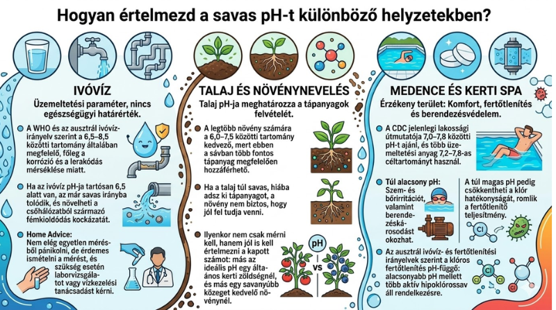 A hétköznapokban a savas pH azért fontos, mert nem elég azt tudni, hogy „savanyú” vagy „nem savanyú”. Azt kell tudnod, hogy az adott közegben ez az érték normális, kezelendő vagy már kockázatos. Ivóvíznél például a túl alacsony pH a csőhálózatot támadhatja, talajnál a tápanyagfelvételt ronthatja, medencében pedig csípheti a szemet és gyengítheti a komfortot.