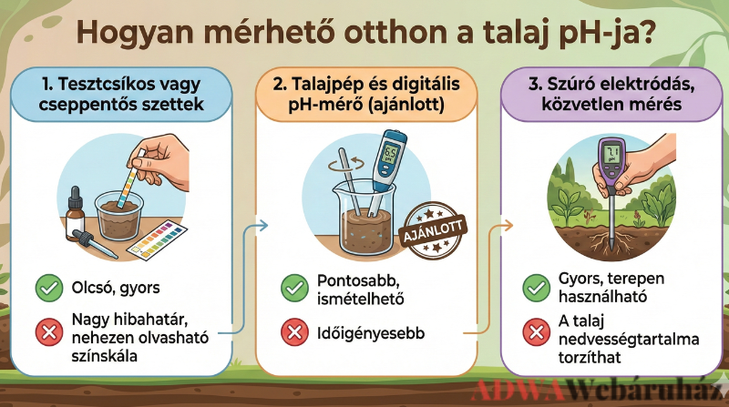 Tipp: A legjobb otthoni megoldás a talajpép + digitális pH-mérő kombinációja.