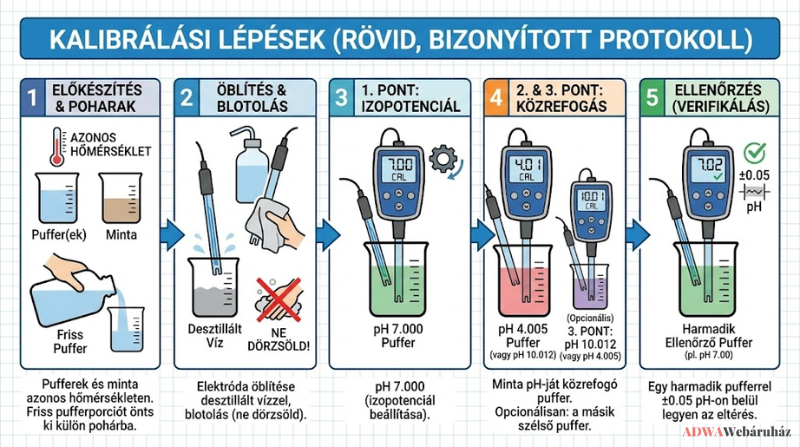 - Válaszd a 7.000 + 10.012 puffereket kétpontos kalibrálásra; a 4.005 puffer jó ellenőrző pont.